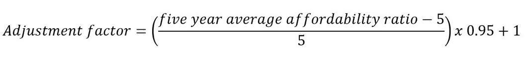If the affordability ratio exceeds 5, an upward adjustment is made to housing needs. For each 1% the ratio is above 5, the housing stock baseline should be increased by 0.95%. an authority with an affordability ratio of 10 will have a 95% increase on its annual housing stock baseline. The formula used for this sliding scale of adjustment is: